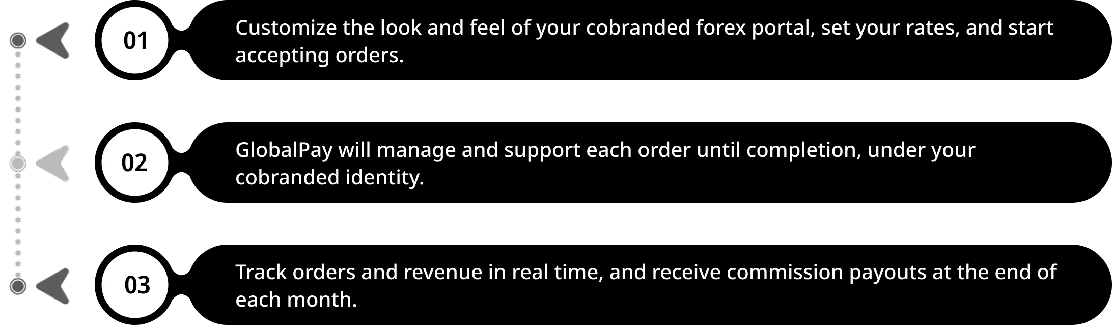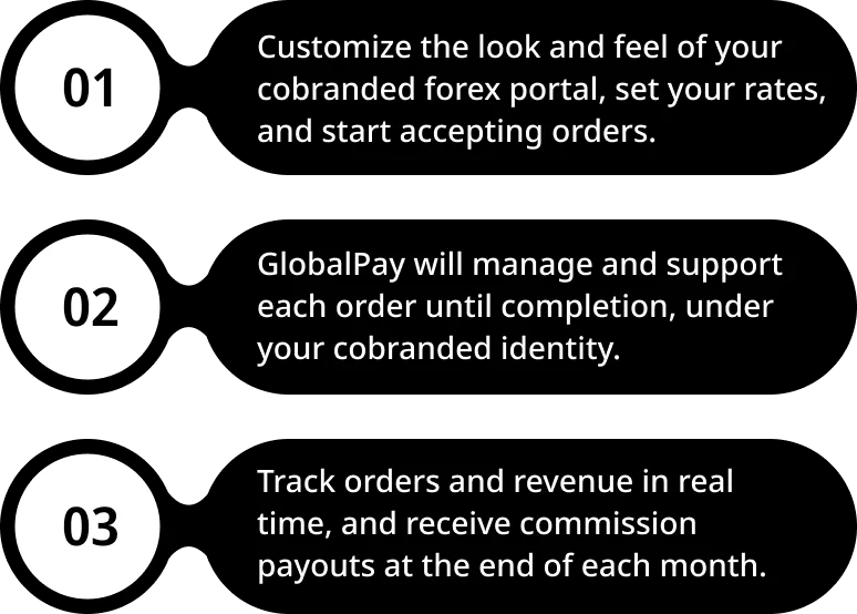 Let your customers’ forex transactions flow smoothly with no intervention from you. Simply point them to your personalized, cobranded forex platform. All orders and support will be seamlessly handled by GlobalPay, ensuring smooth and efficient service delivery.